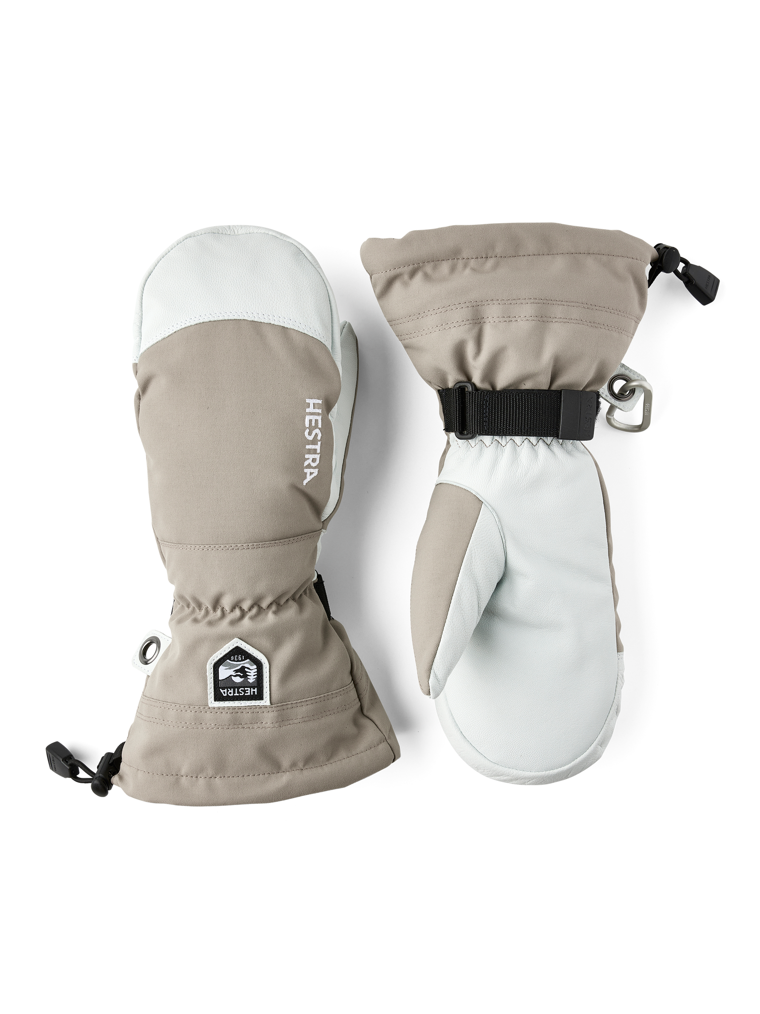 Hestra's Army Leather Heli Ski was originally created for ski guides in western Canada who needed a reliable and warm ski glove for long, cold days in the snow. This women's mitten has a narrower cut to fit women's narrower hands. Like all mitten versions, it provides plenty of space for the fingers, making it warmer than the equivalent glove. The outer glove is sewn in a hardwearing, weather-resistant combination of goatskin leather and 3-layer polyamide fabric. A range of smart functions come in handy when you can't head indoors to warm up that often. For example, the liner is easy to remove and dry, or replace with a thinner inner glove when you're being more active and hiking uphill. In powder snow, the long cuff with snowlock and wrist adjustment keep the snow on the outside and the warmth on the inside. A wrist strap reduces the risk of dropping a glove if you take it off to adjust your equipment or use your phone. And the included carabiner means you can hang the glove up with its opening facing downwards – practical while you're wearing just a thinner liner and want to avoid your gloves filling up with snow. A durable, flexible companion for skiers that spend a lot of time outdoors and who often find themselves far from the ski resort and its comforts. Also available in 3-finger and 5-finger models.