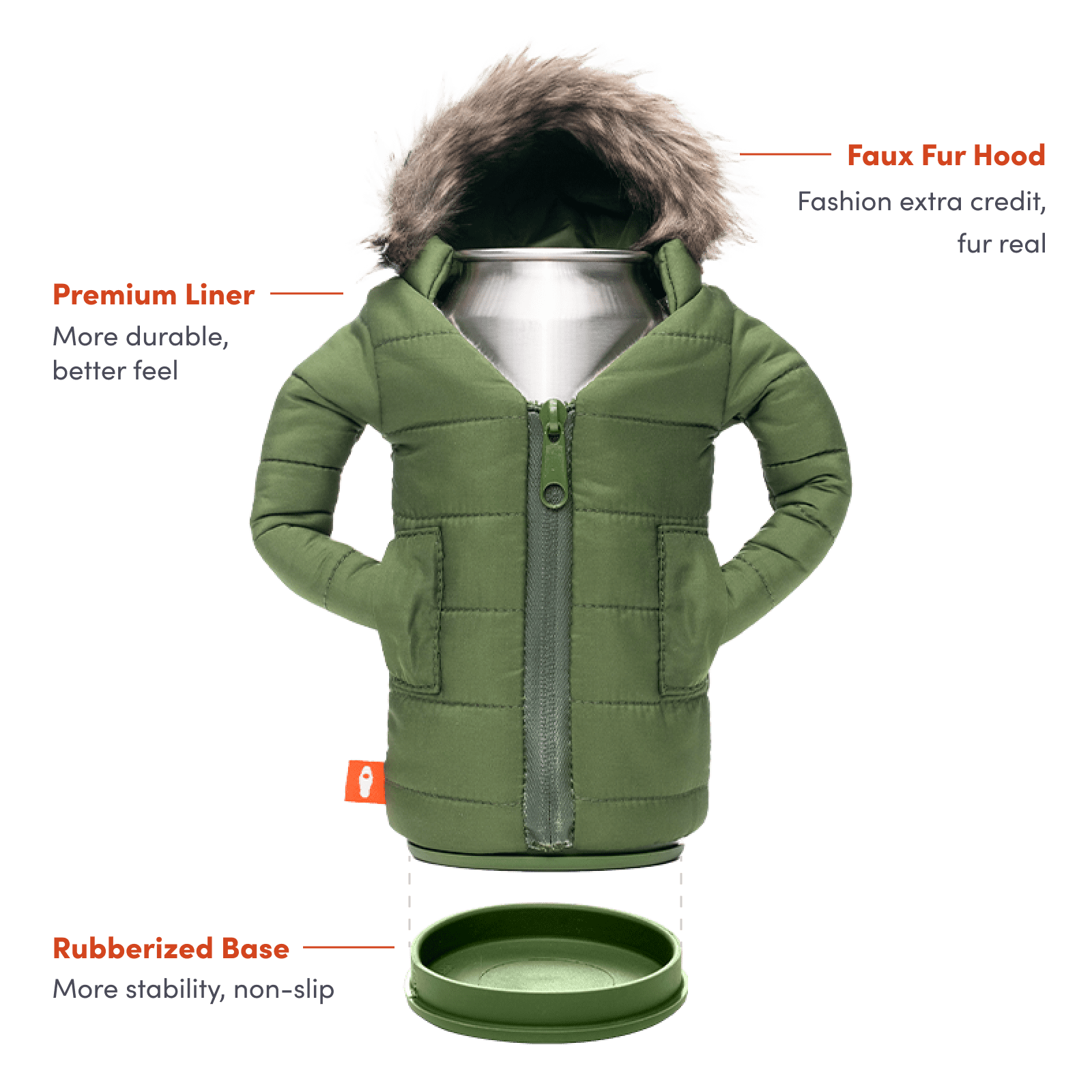 Add some flare to your winter drinkwear wardrobe with a cozy Puffin Parka. The faux fur-lined hood brings a touch of glamour to a timeless classic. This diva will keep your drink cold and looking fabulous.